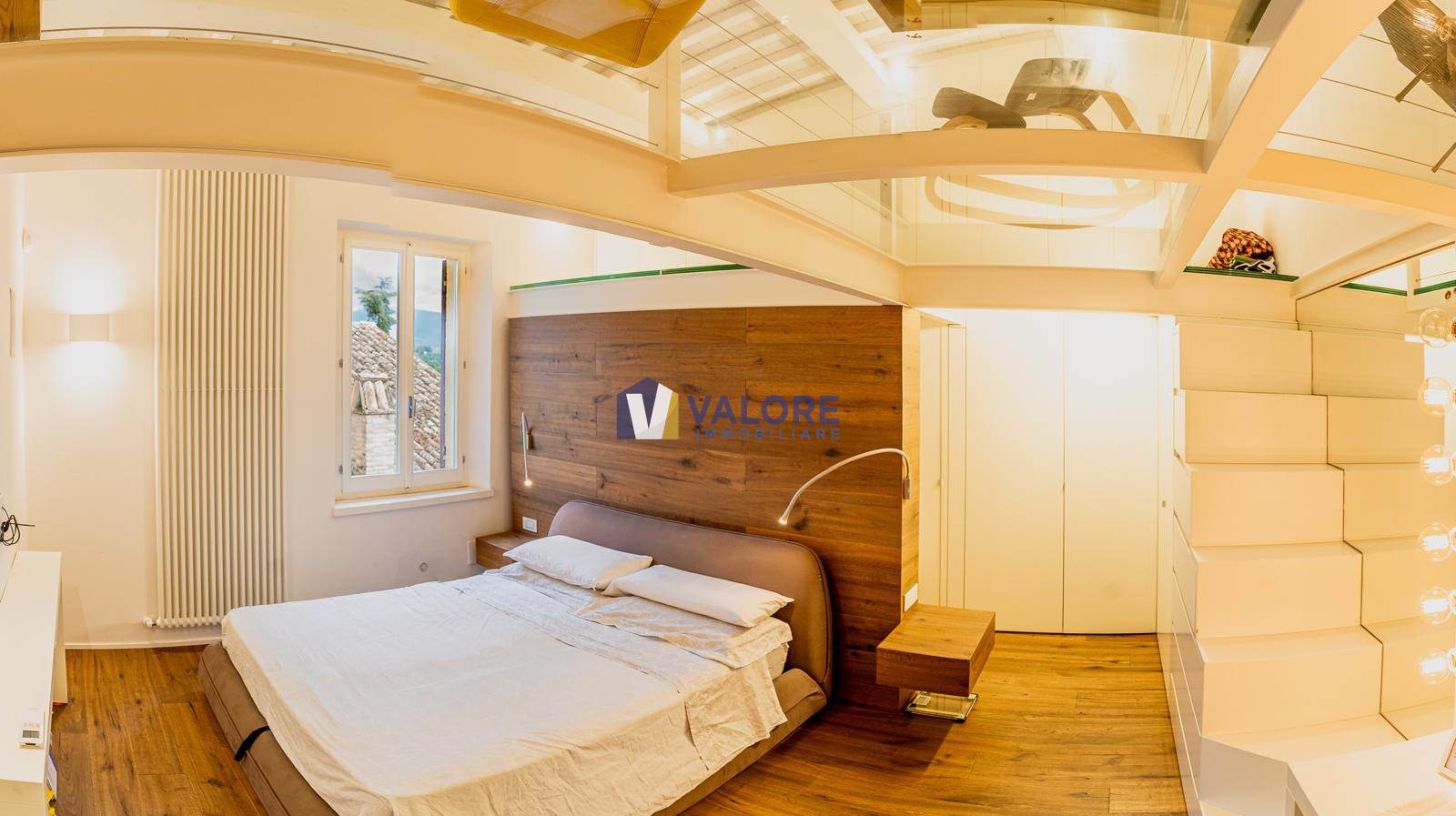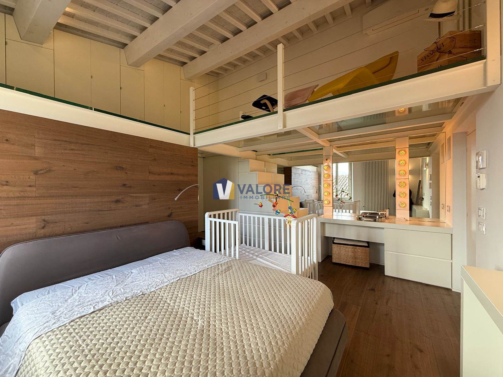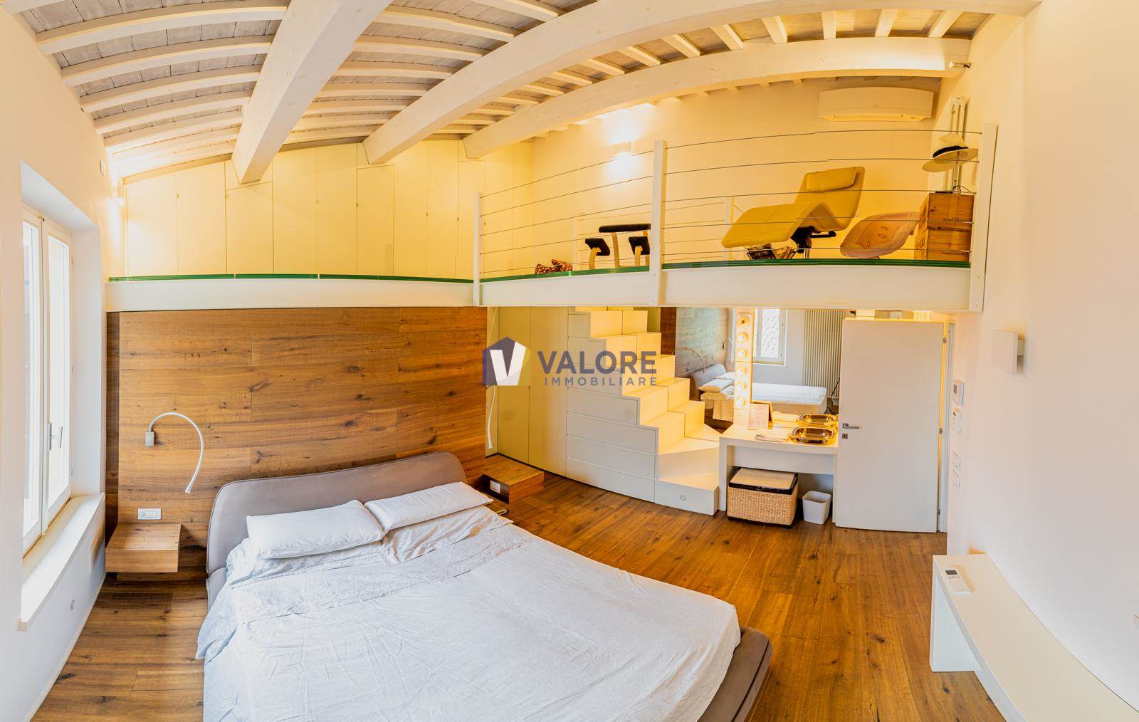 The second floor, enhanced by ceilings with exposed whitewashed wooden beams, accommodates a large master bedroom with a refined loft, a balcony, and a second bathroom.