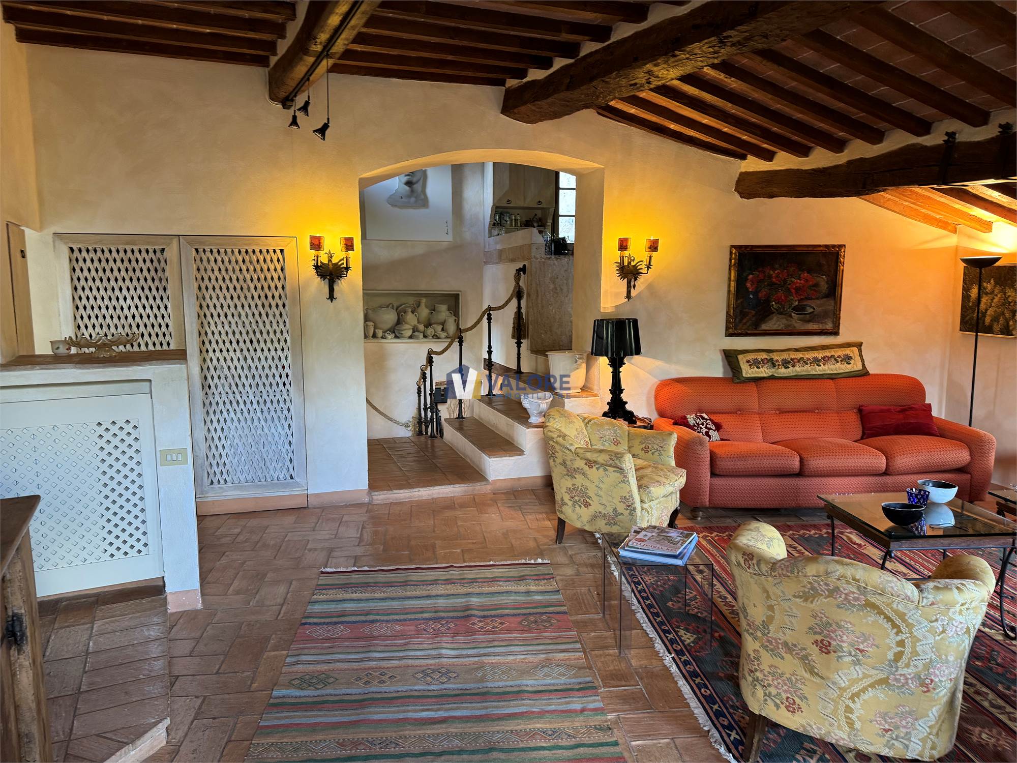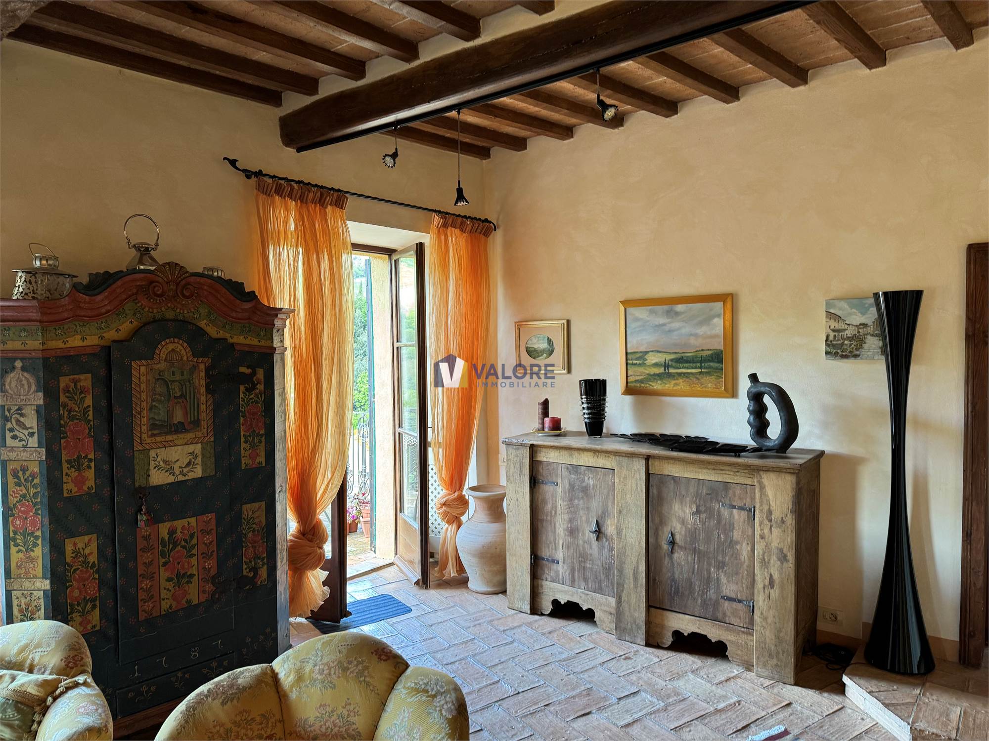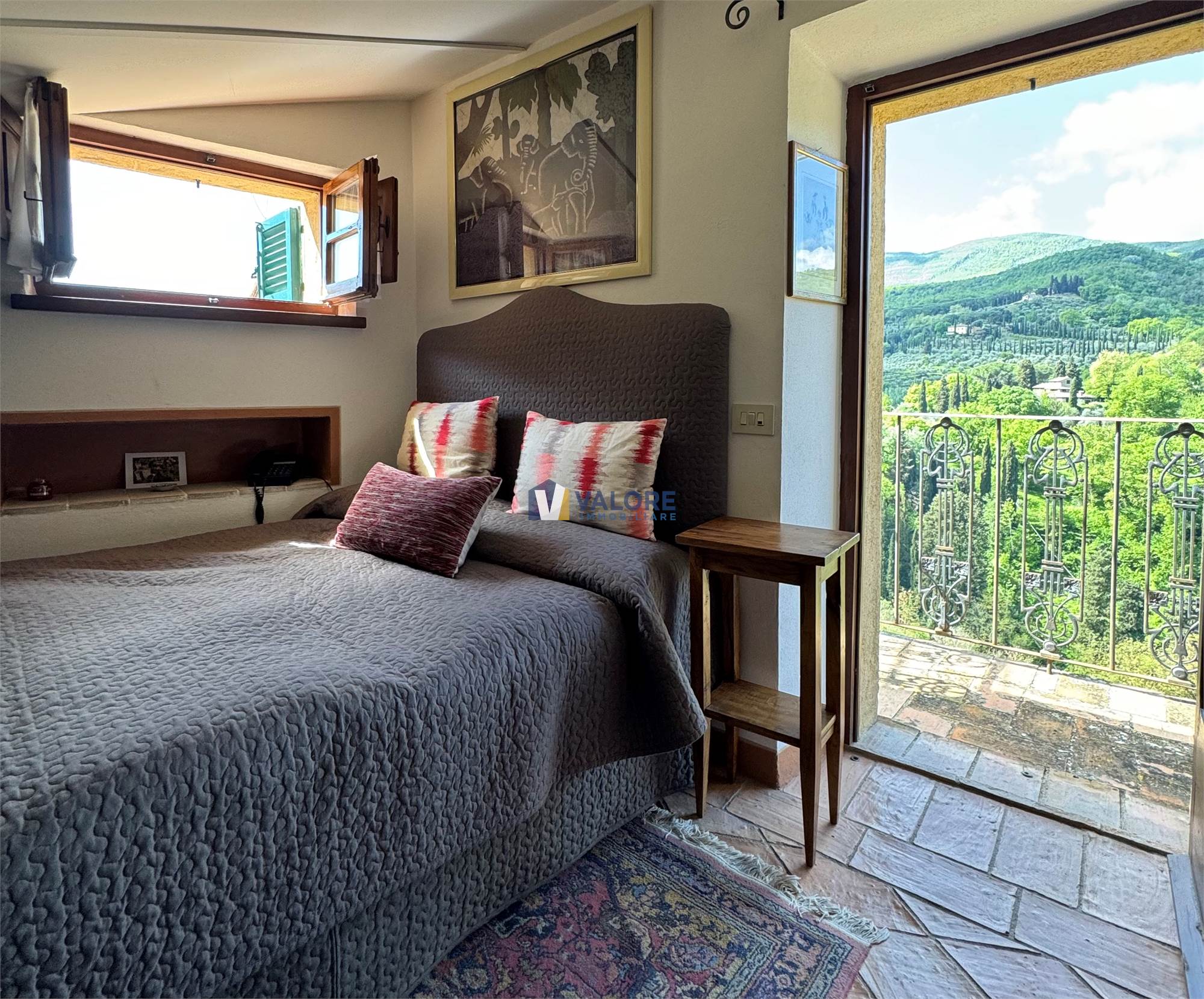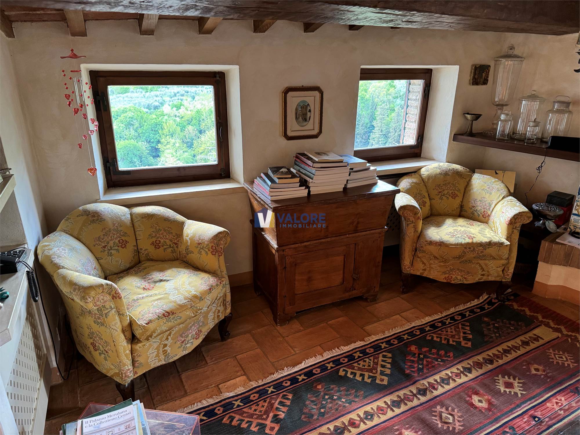 Ogni finestra si trasforma in un quadro naturale, mentre la luce esalta le tonalità calde dei materiali tipici toscani. L’intera abitazione è pavimentata in cotto fatto a mano, che dona continuità, calore e autenticità agli ambienti.