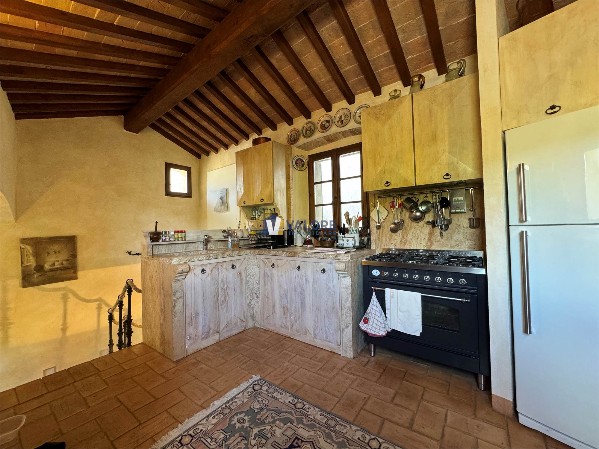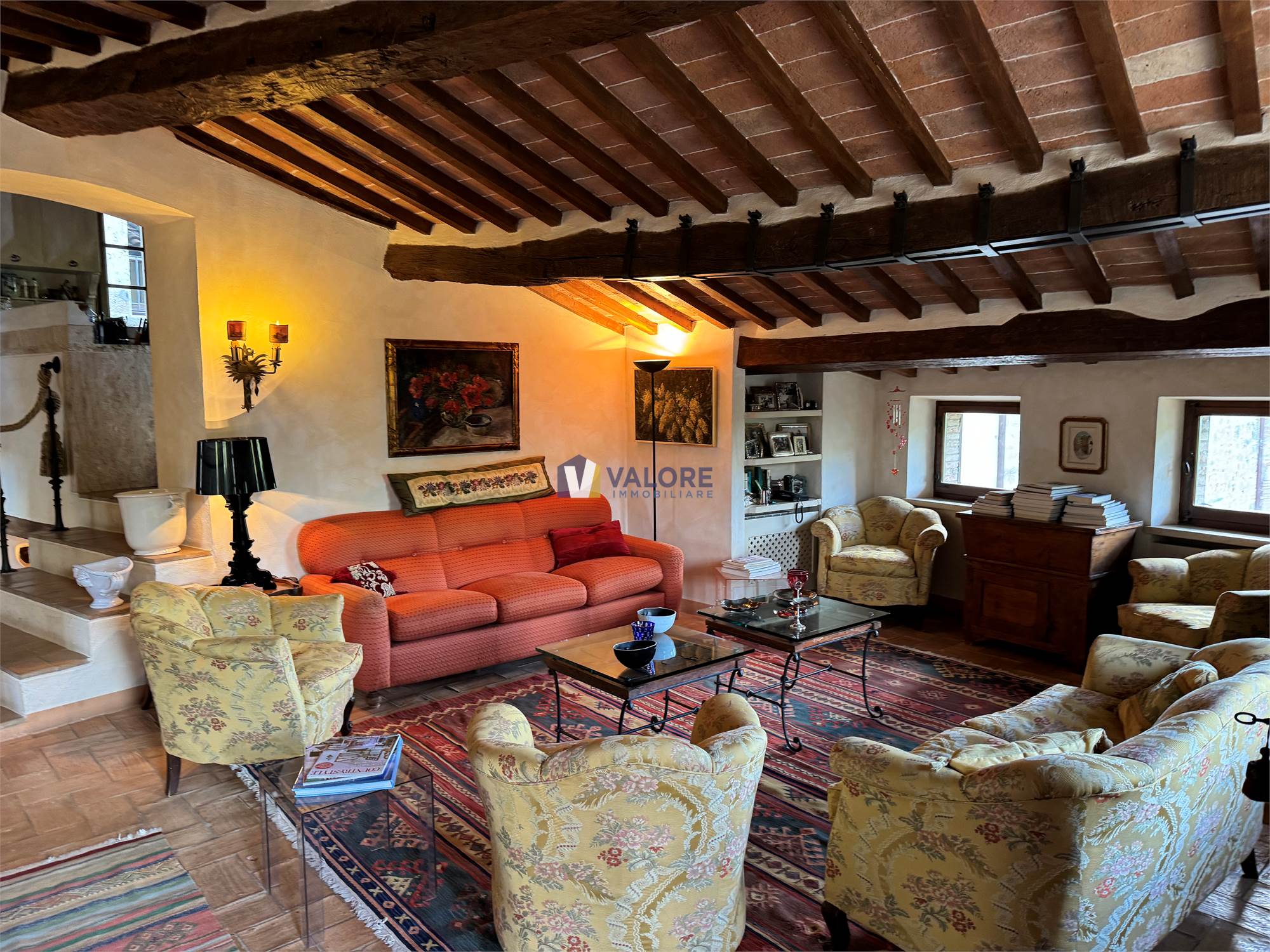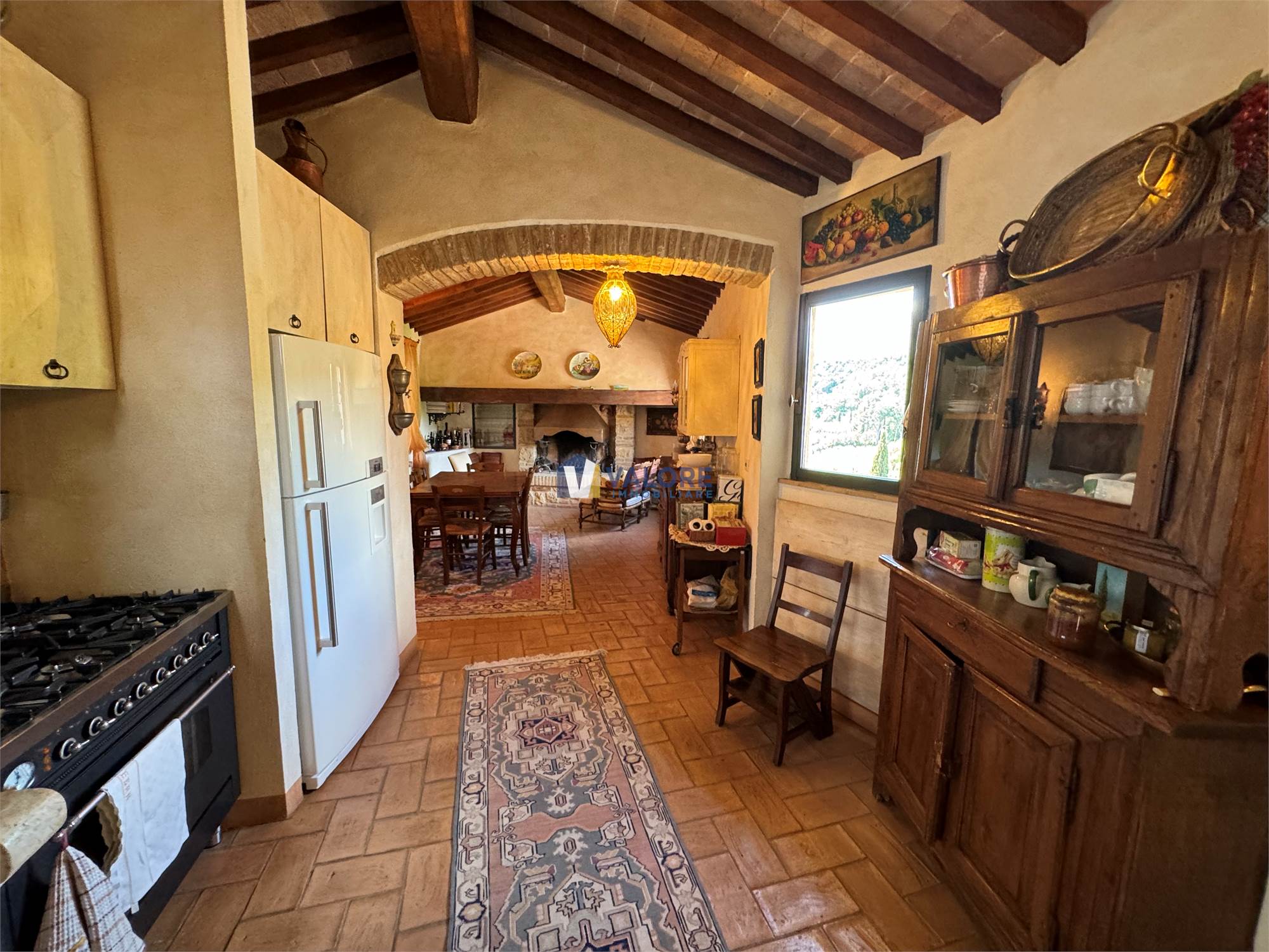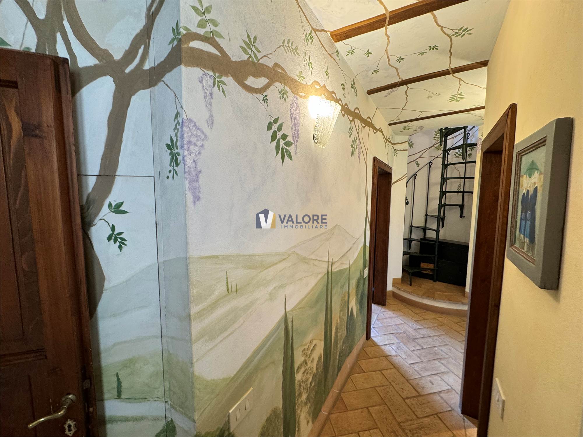 Ogni finestra si trasforma in un quadro naturale, mentre la luce esalta le tonalità calde dei materiali tipici toscani. L’intera abitazione è pavimentata in cotto fatto a mano, che dona continuità, calore e autenticità agli ambienti.