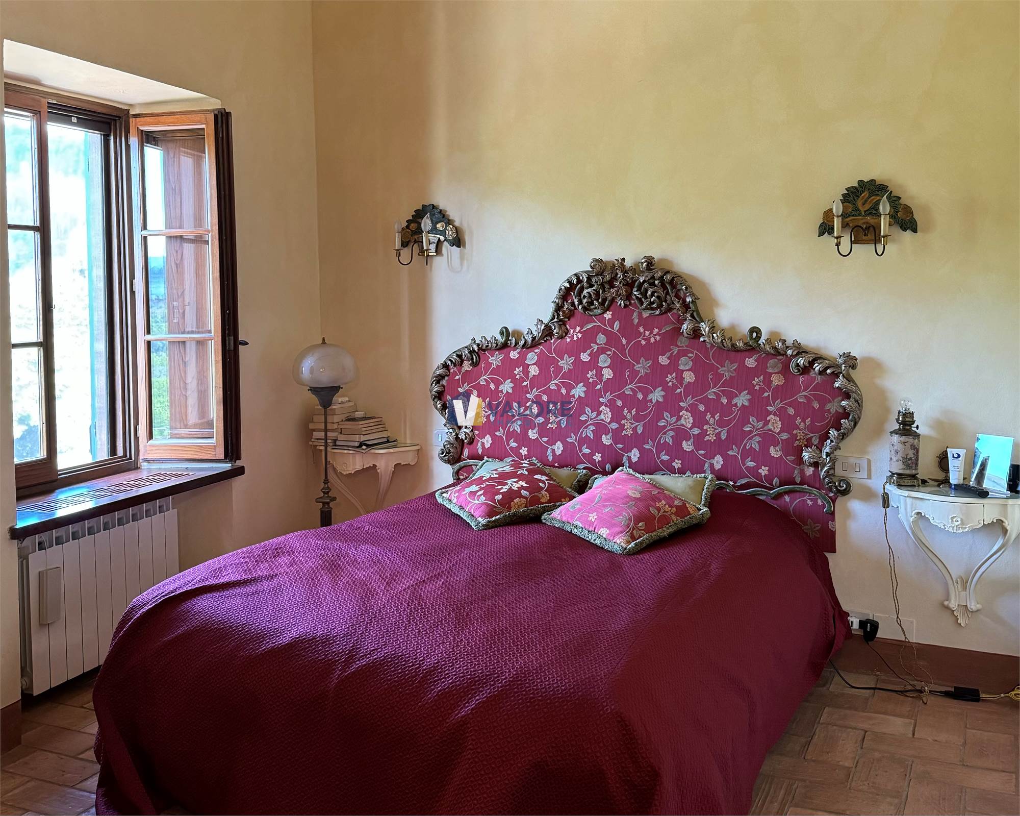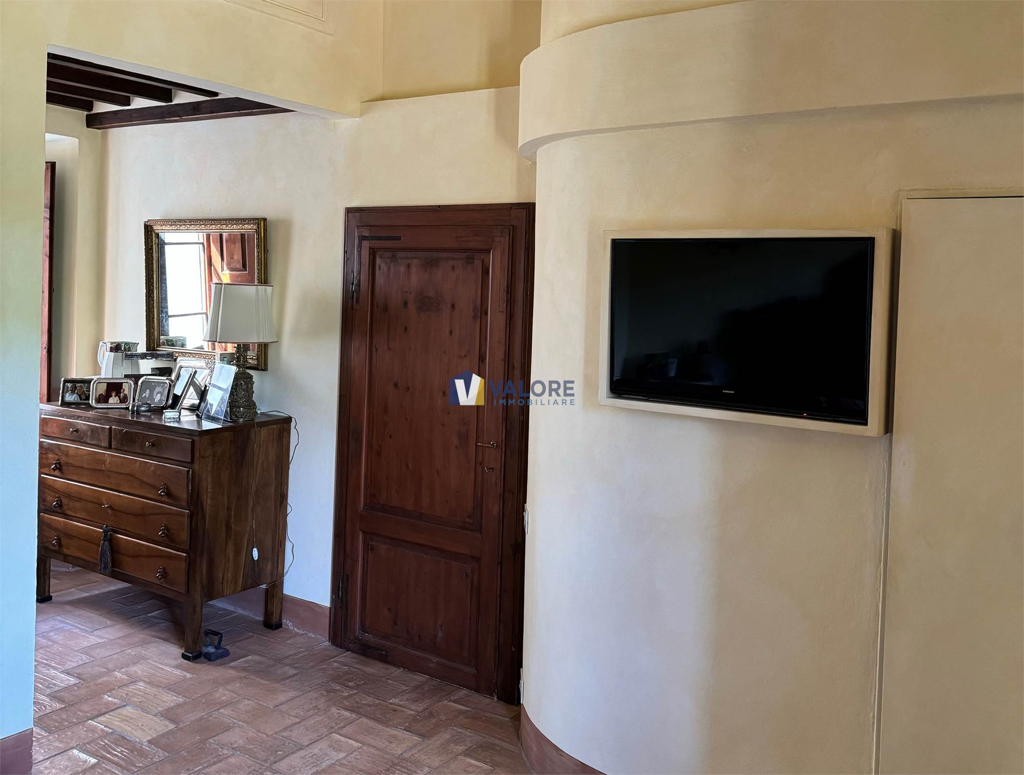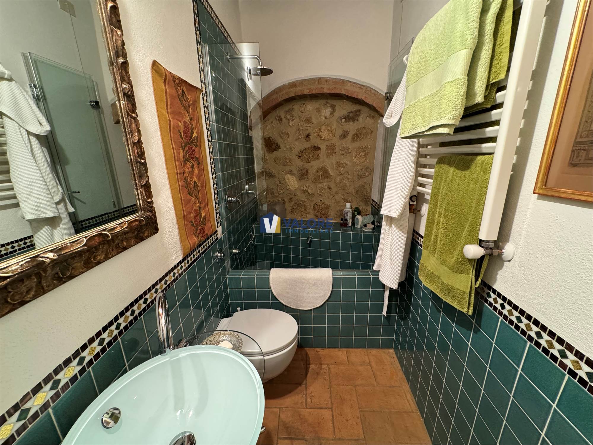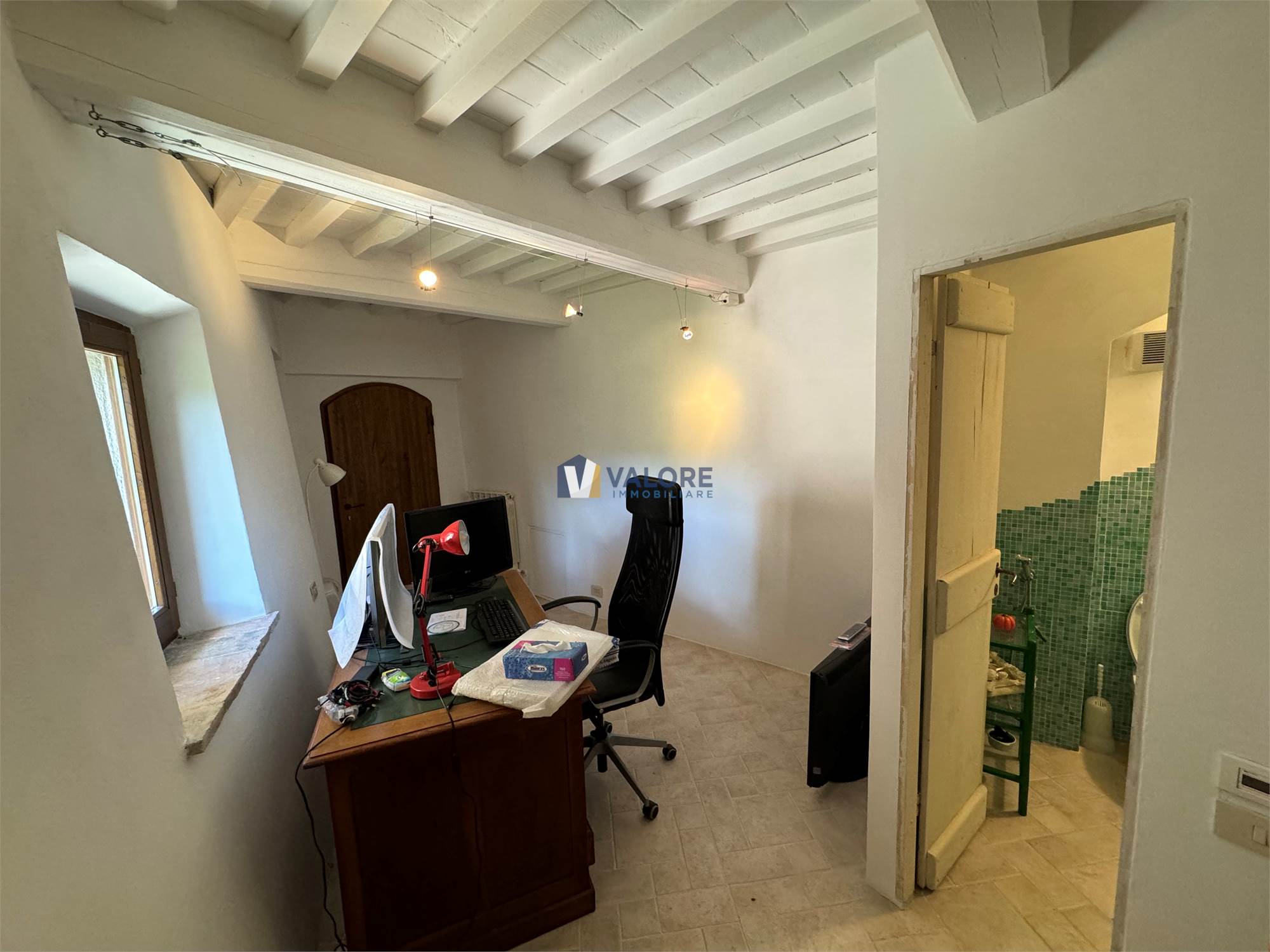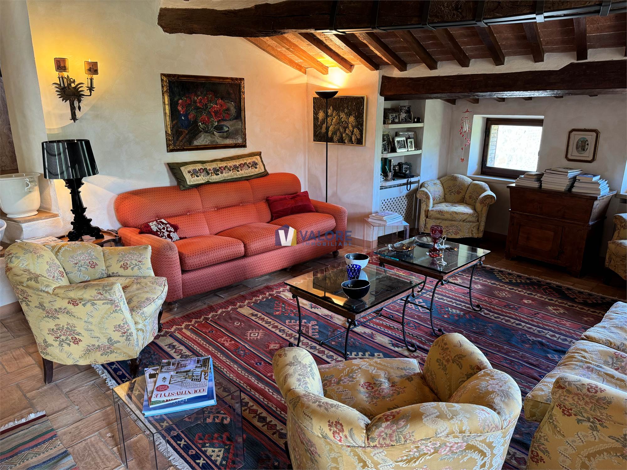 Ogni finestra si trasforma in un quadro naturale, mentre la luce esalta le tonalità calde dei materiali tipici toscani. L’intera abitazione è pavimentata in cotto fatto a mano, che dona continuità, calore e autenticità agli ambienti.