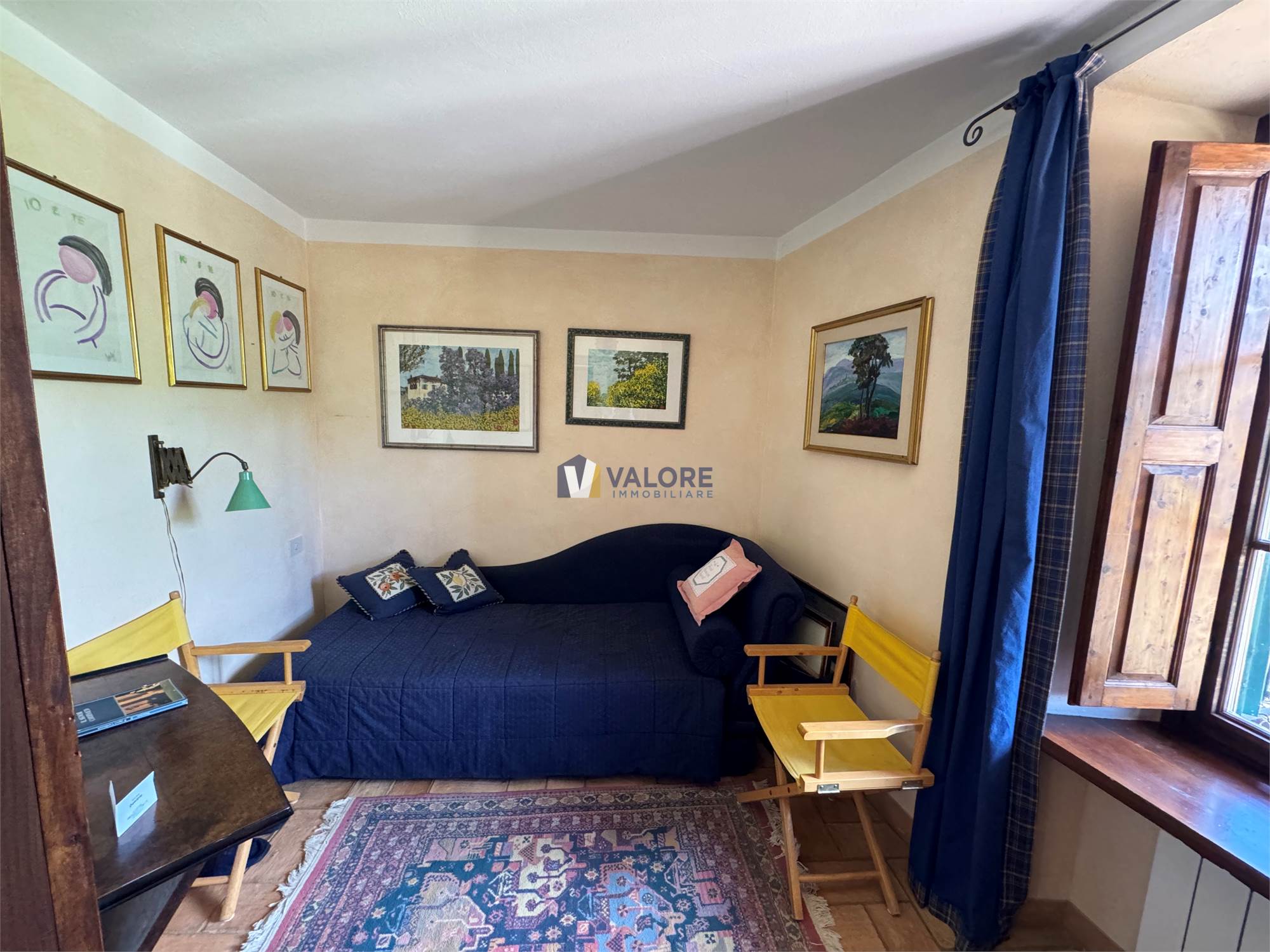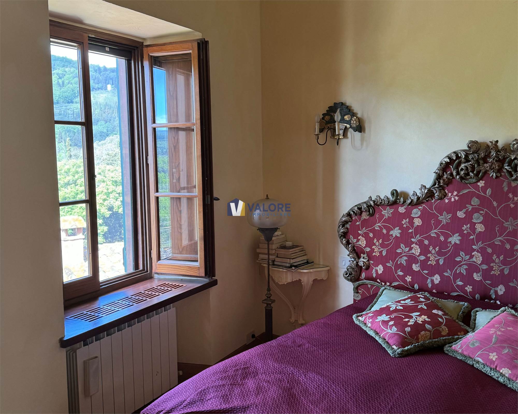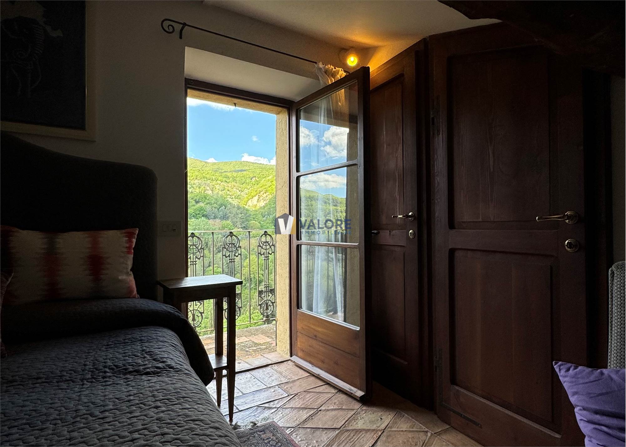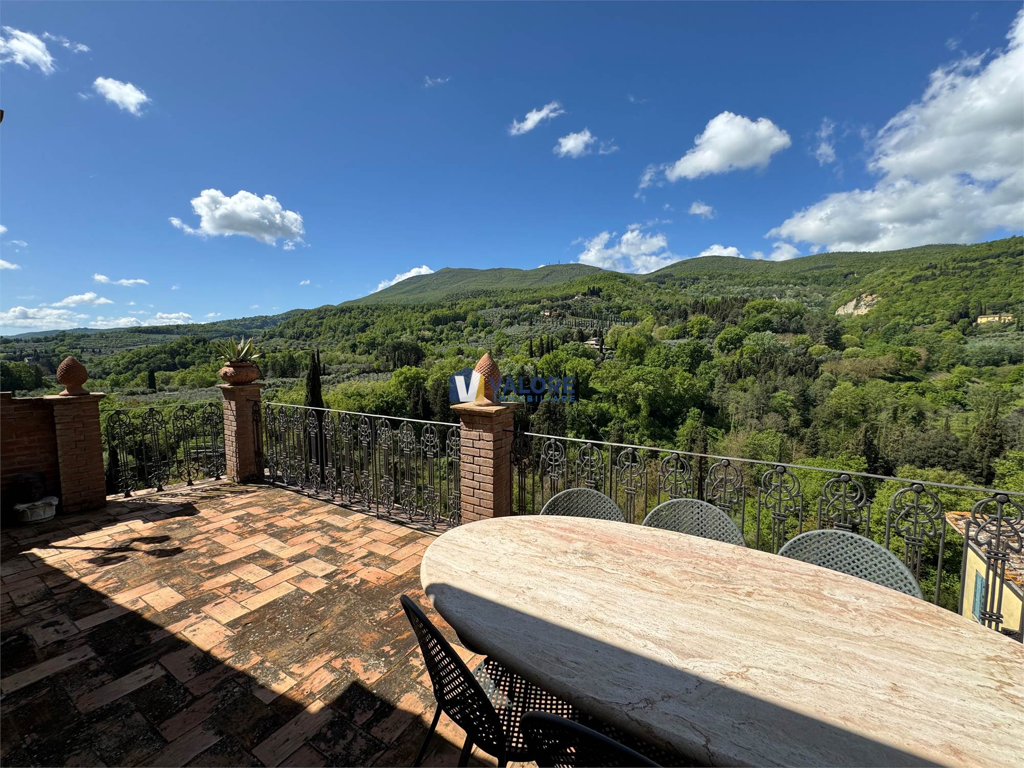 Ogni finestra si trasforma in un quadro naturale, mentre la luce esalta le tonalità calde dei materiali tipici toscani. L’intera abitazione è pavimentata in cotto fatto a mano, che dona continuità, calore e autenticità agli ambienti.