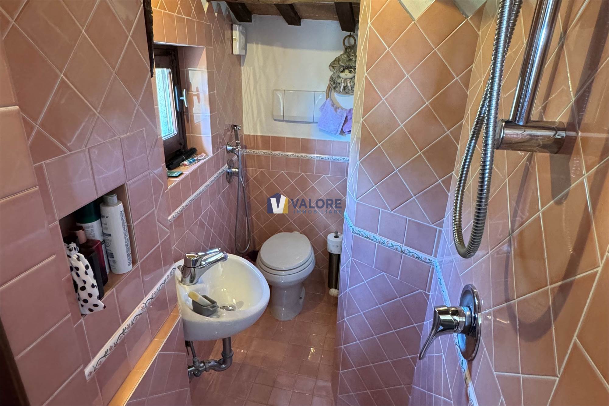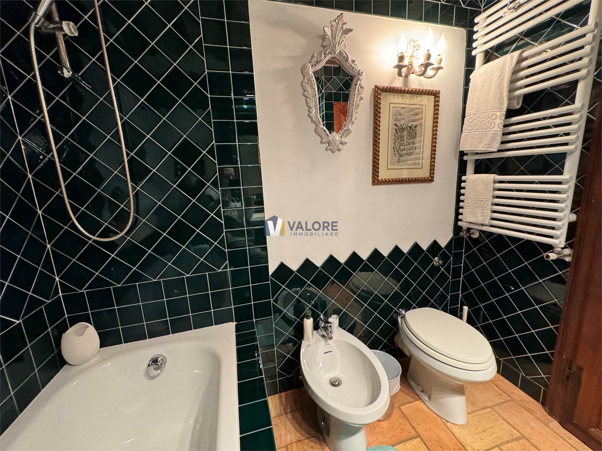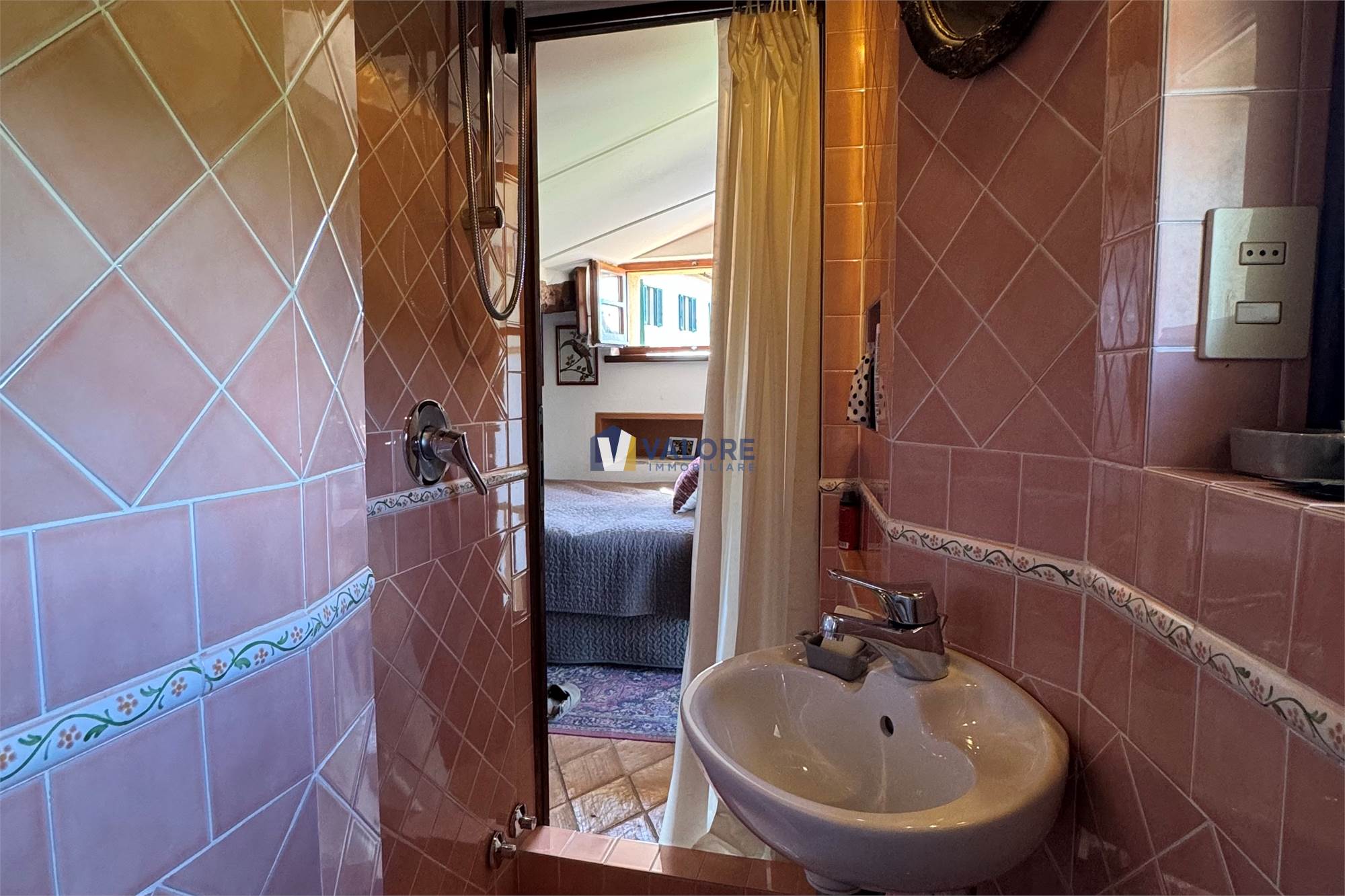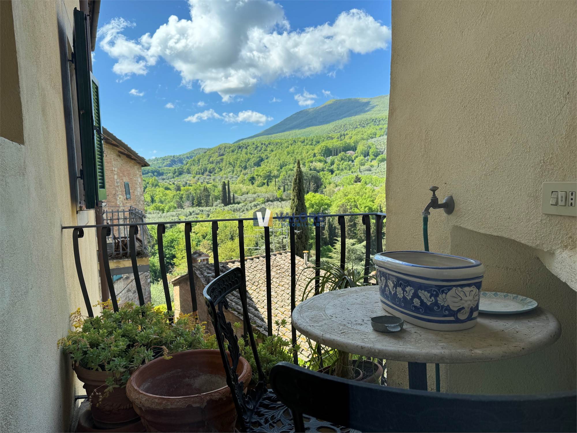 Ogni finestra si trasforma in un quadro naturale, mentre la luce esalta le tonalità calde dei materiali tipici toscani. L’intera abitazione è pavimentata in cotto fatto a mano, che dona continuità, calore e autenticità agli ambienti.