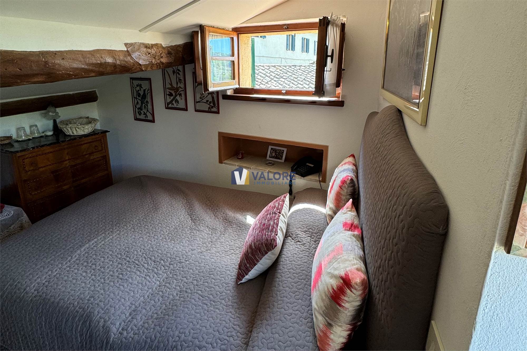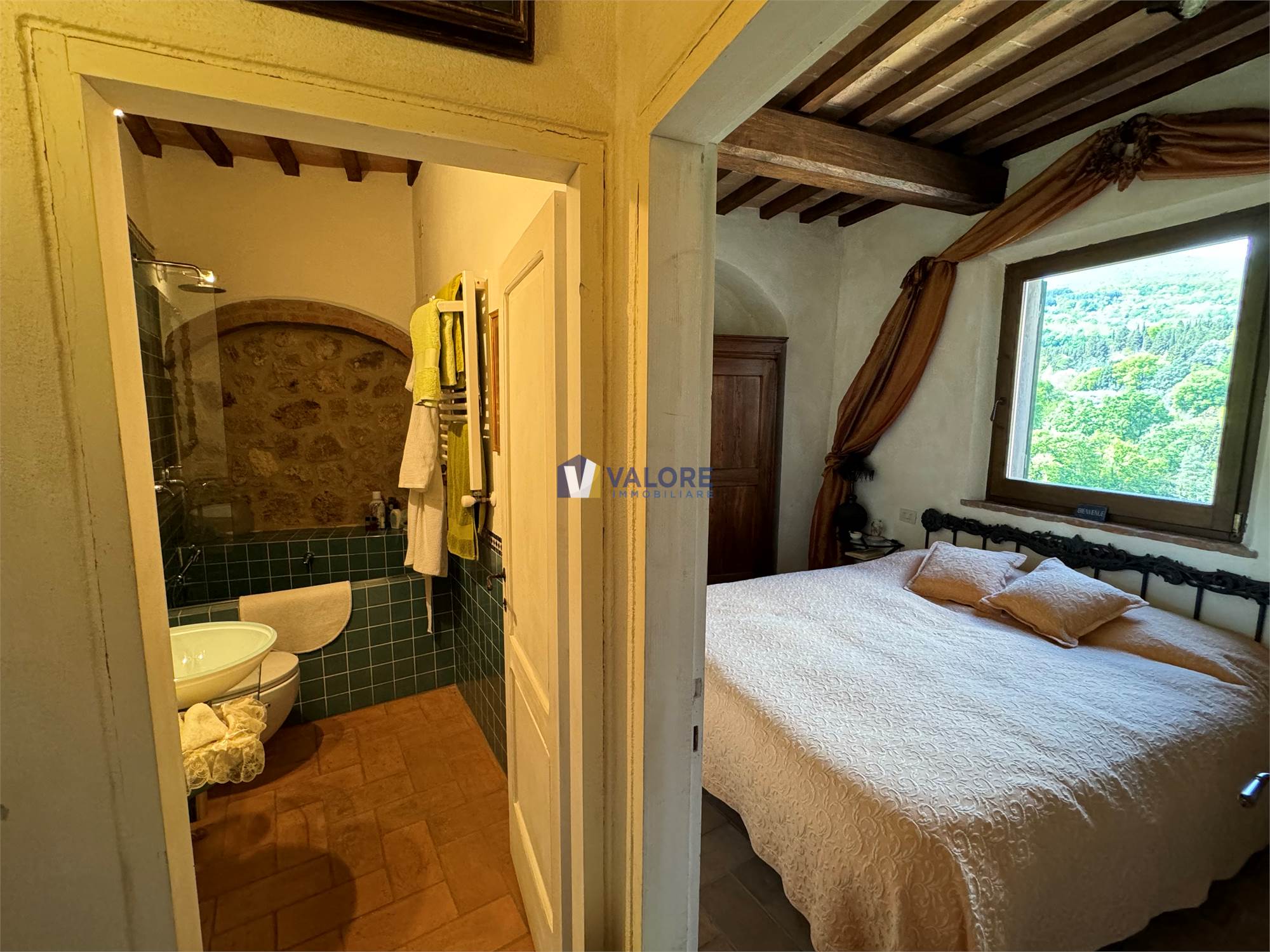 L’ingresso introduce in una prima camera, finemente arredata, con bagno antistante e un’ampia finestra che incornicia la valle e il Monte Cetona.