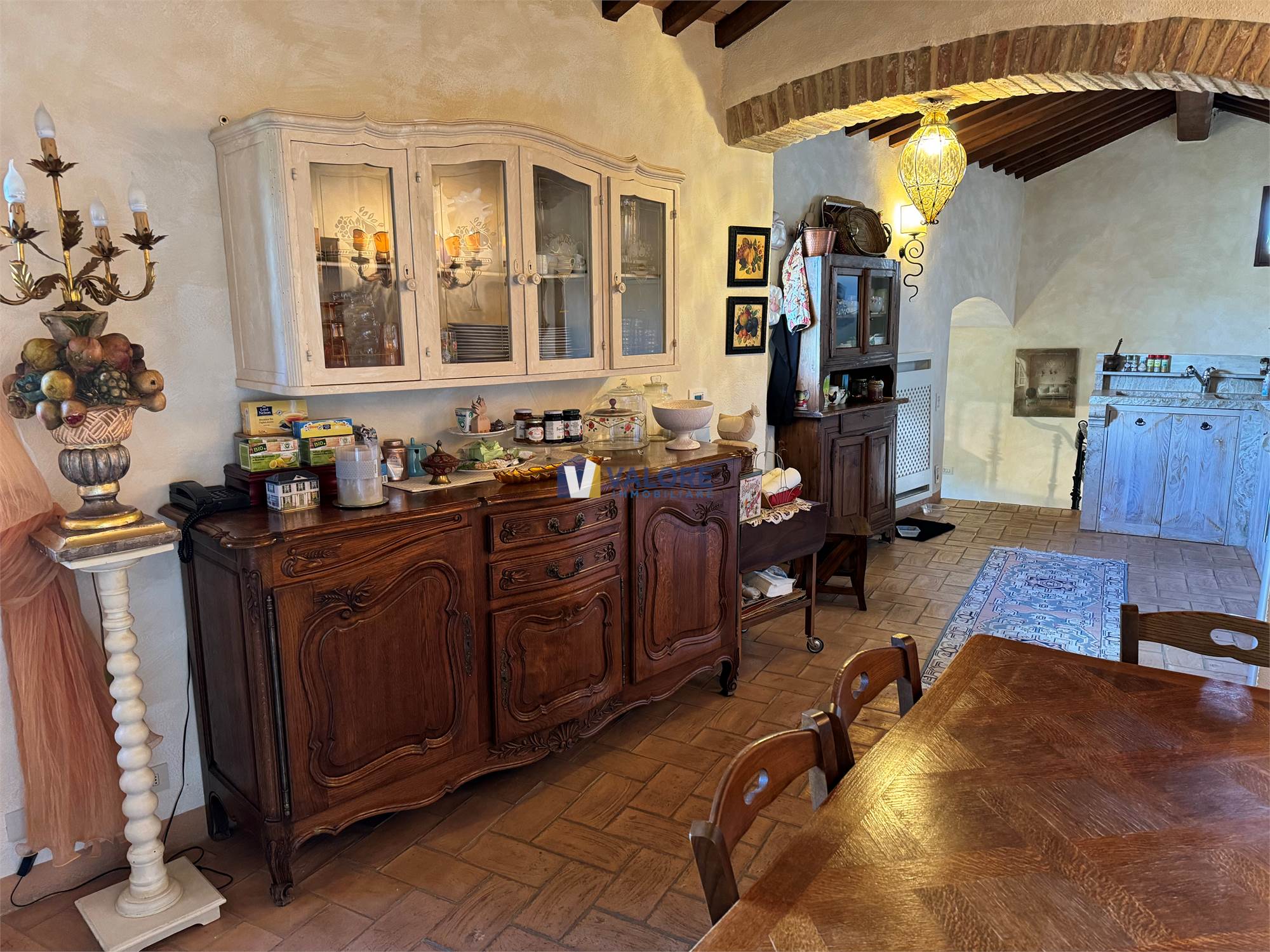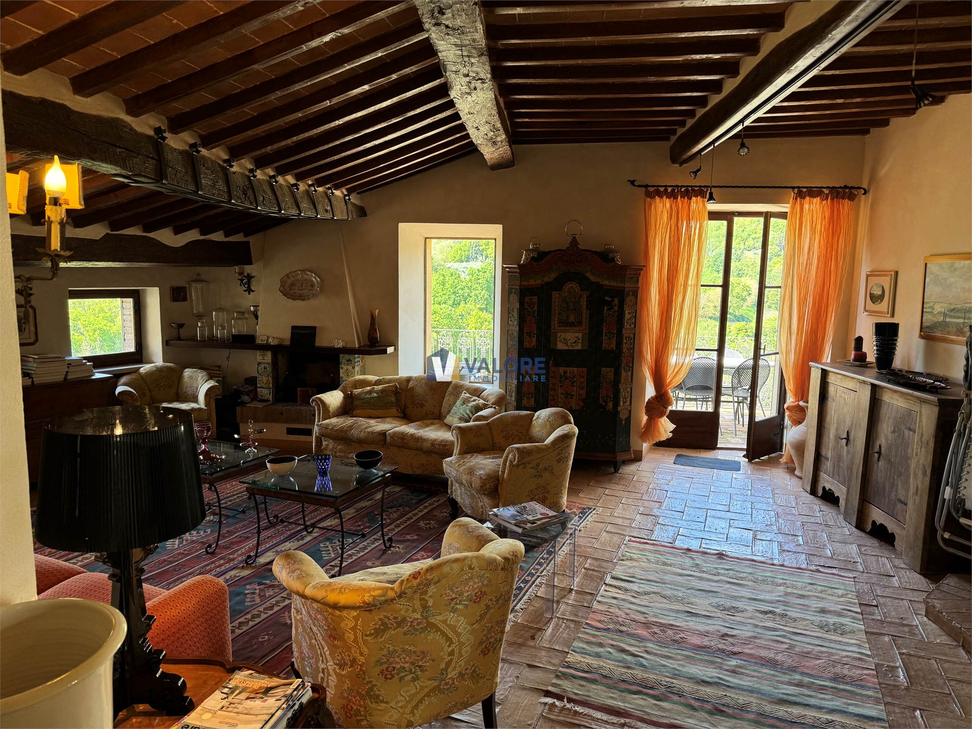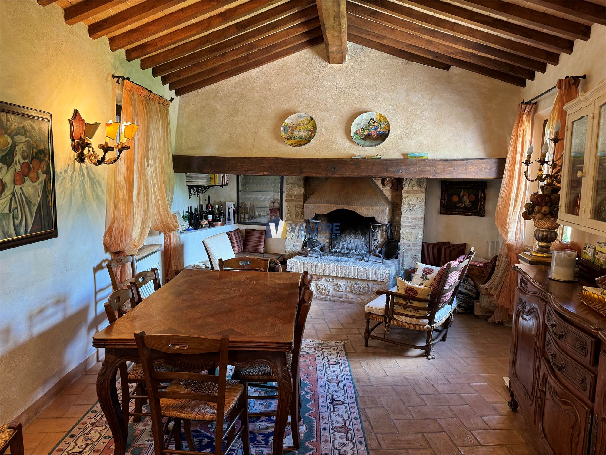 In continuità si apre il grande salone di rappresentanza, molto luminoso e impreziosito da un camino d’epoca e da una magnifica terrazza panoramica, dotata di tenda elettrica ombreggiante e tavolo in marmo, che offre una delle viste più spettacolari del paese, spaziando sulla vallata e sul profilo del Monte Cetona.