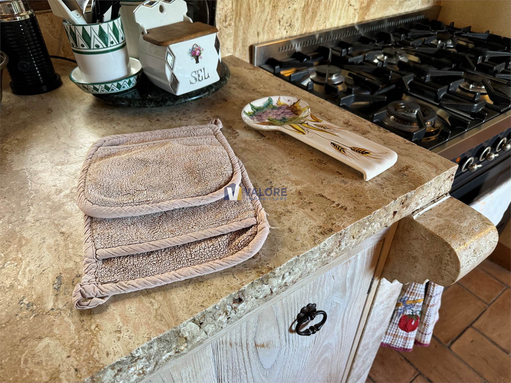 La cucina, realizzata su disegno da un artigiano locale, combina marmi provenienti da San Casciano dei Bagni e pensili in legno pregiato, esprimendo un perfetto equilibrio tra tradizione e funzionalità.