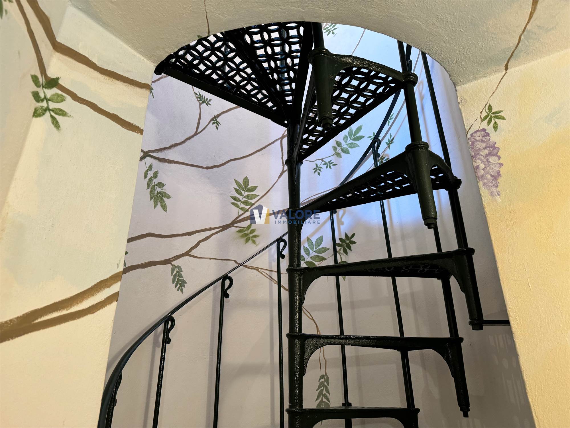 Una scala a chiocciola in ghisa conduce infine al piano superiore, dove si trova un’ulteriore stanza, intima e suggestiva, con bagno privato e terrazzino panoramico.