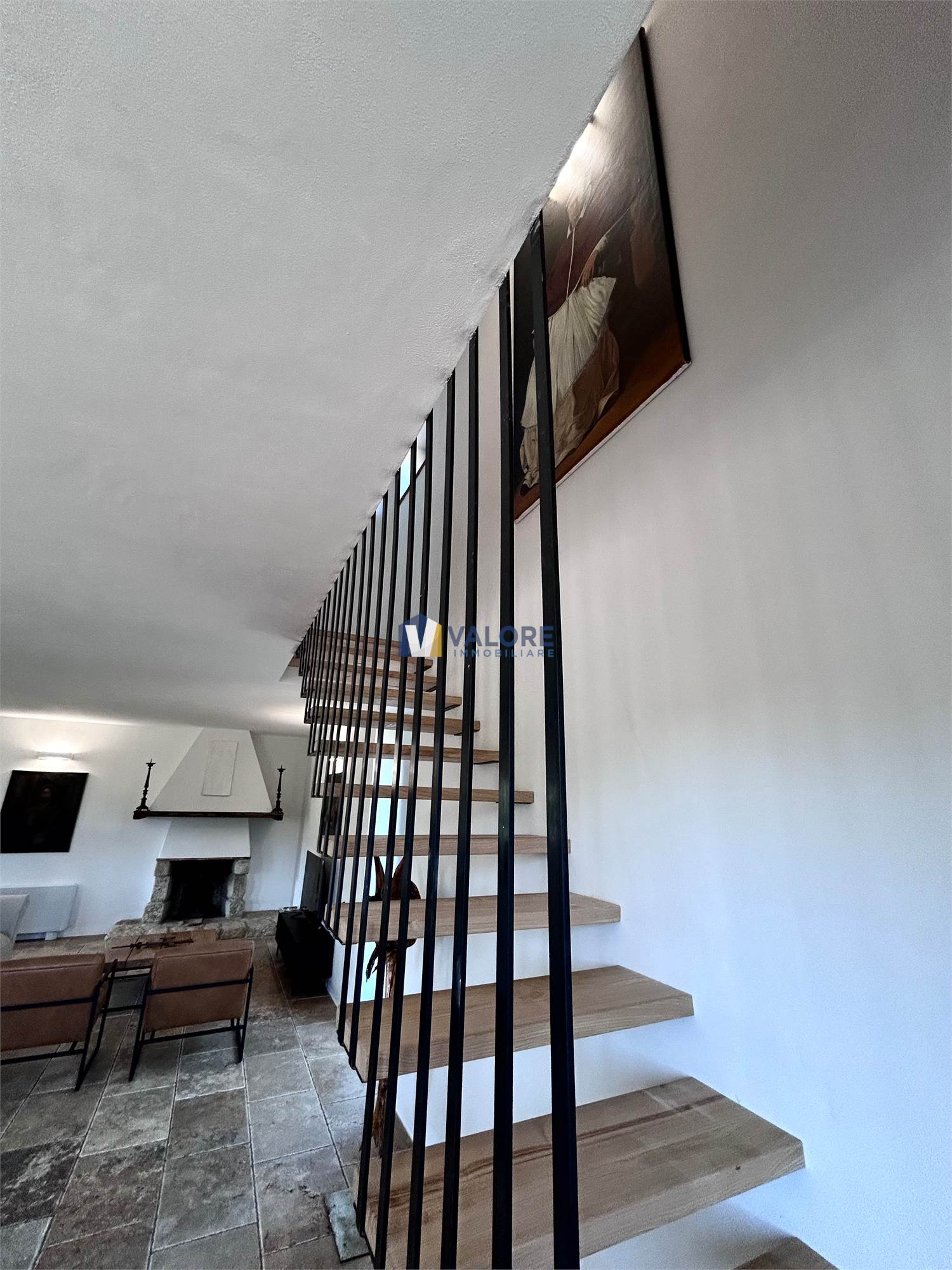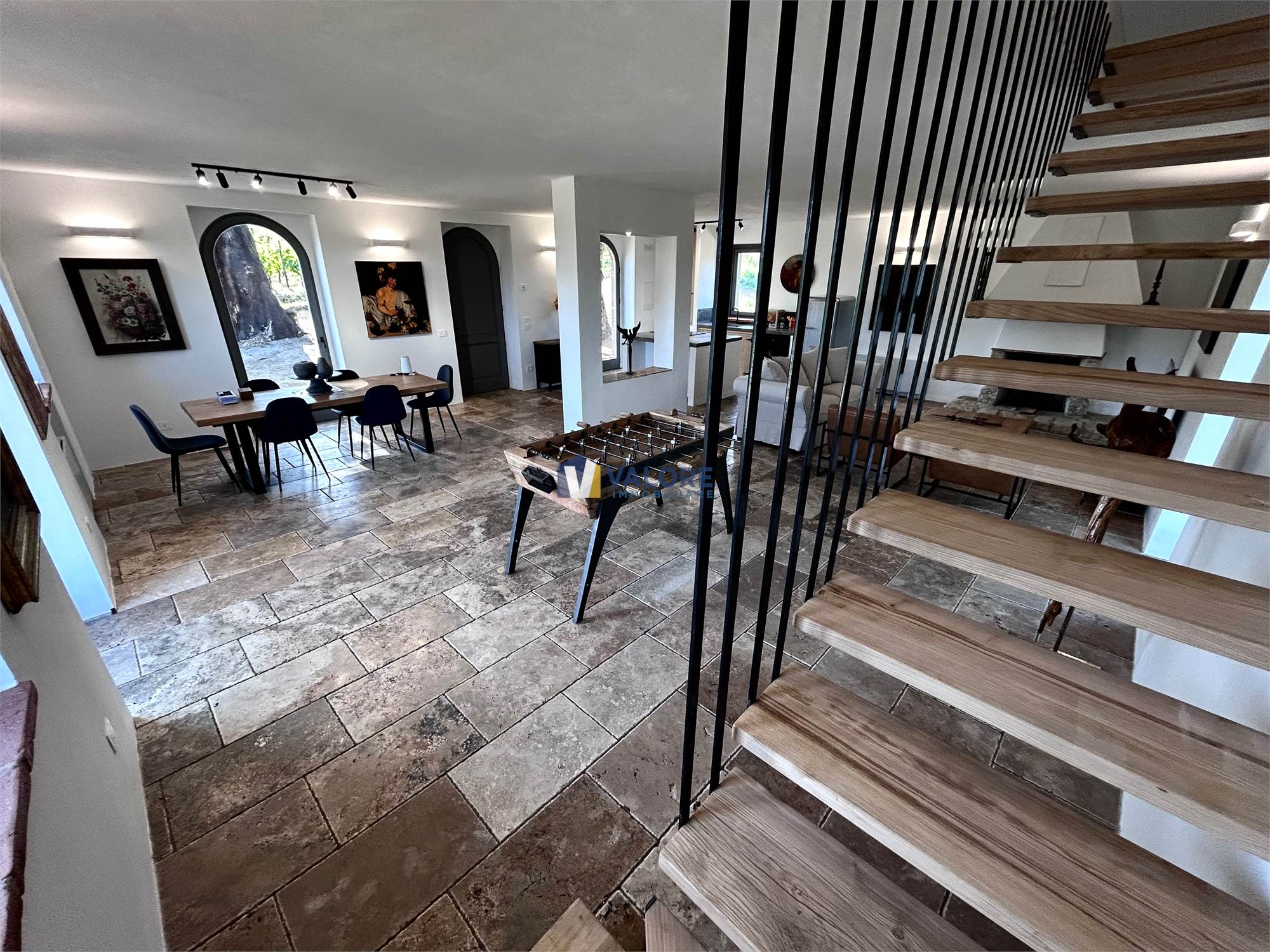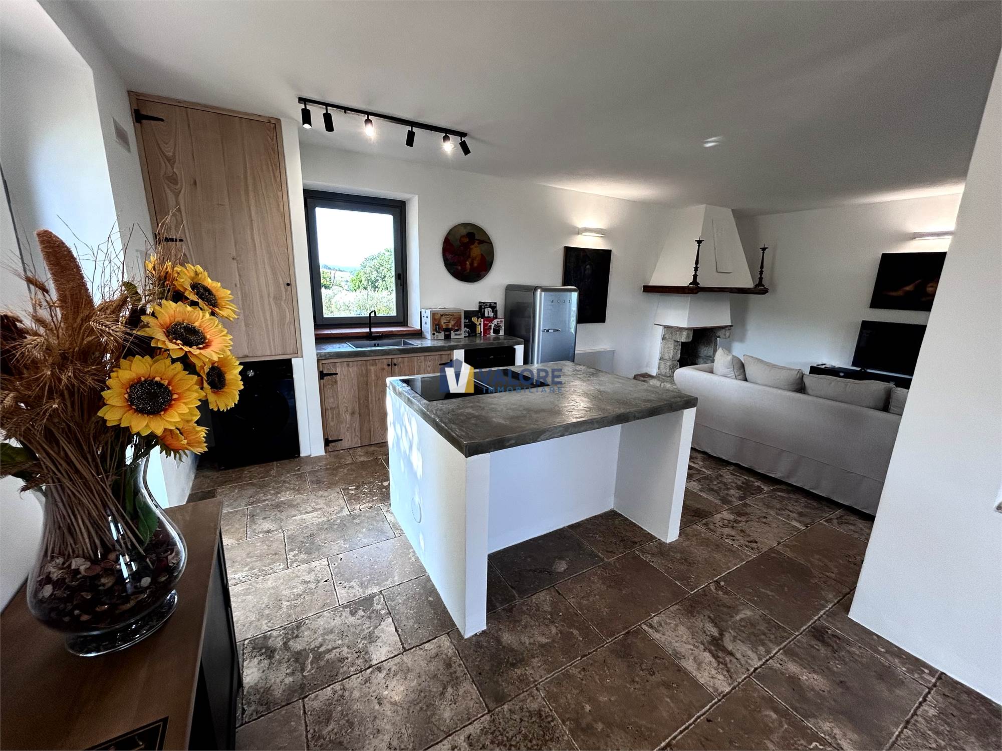 Al piano terra è presente un ampio open space con una cucina in muratura ed uno spazioso soggiorno con un suggestivo camino in pietra oltre ad un patio esterno di 35 mq.