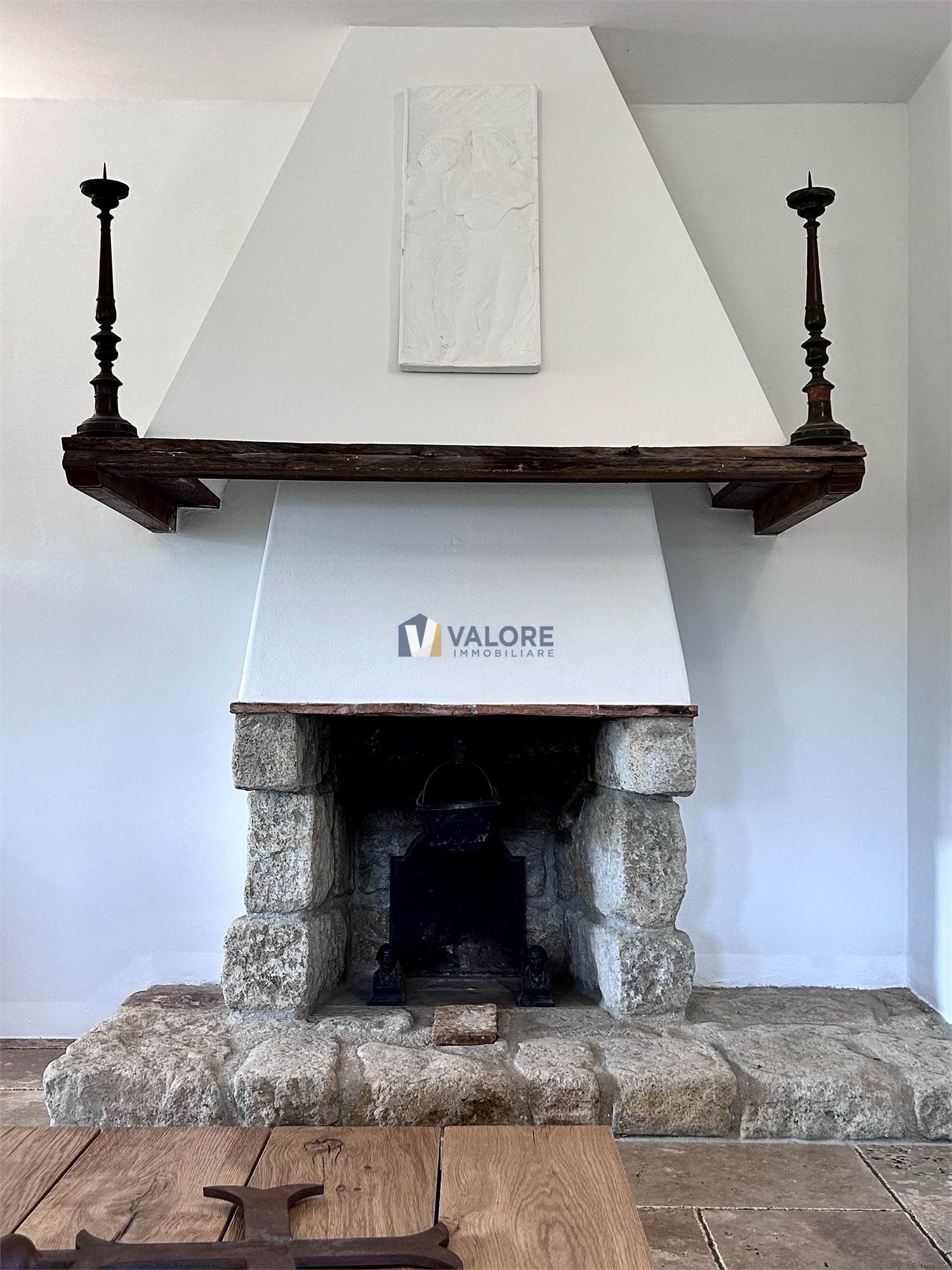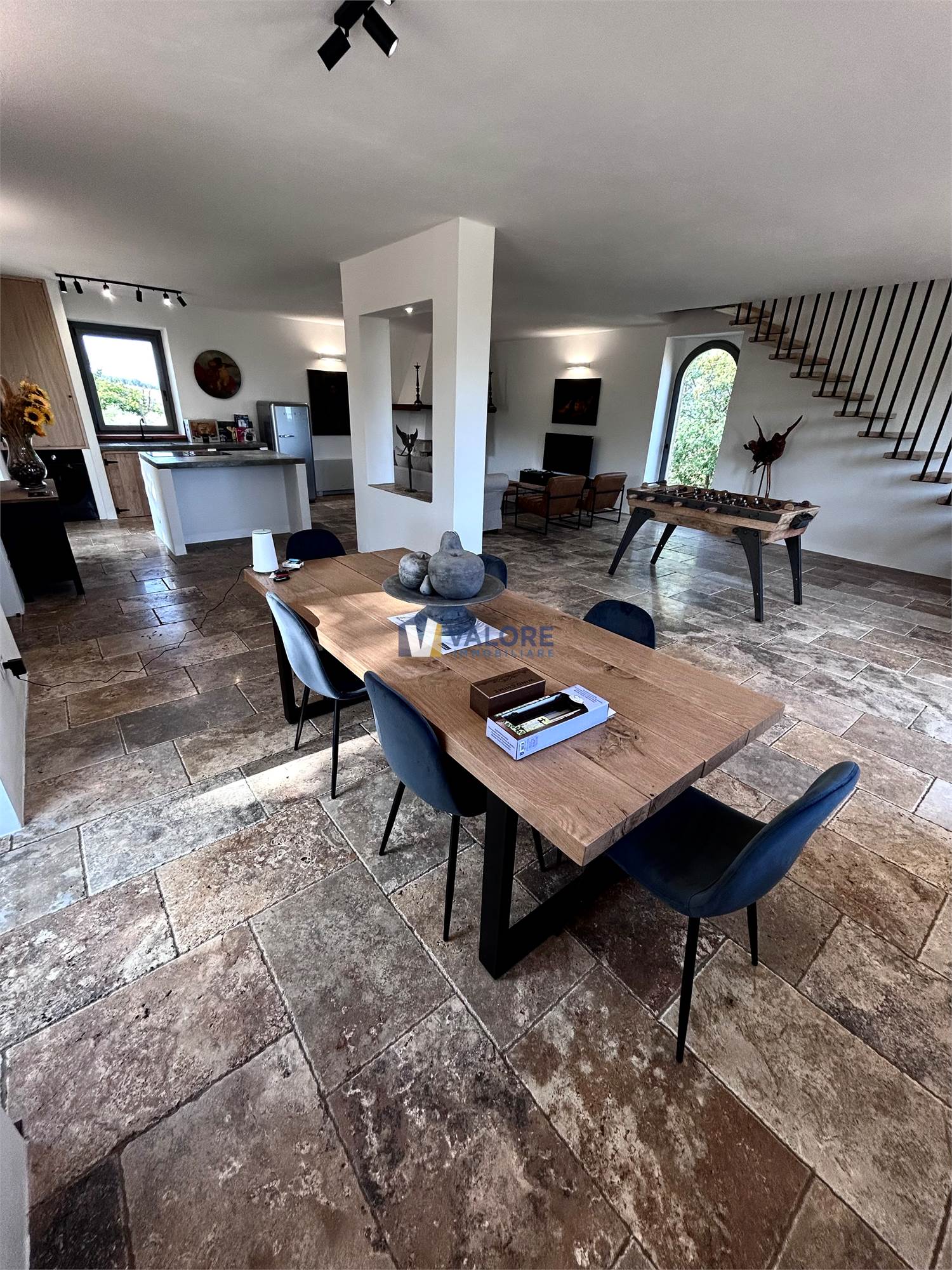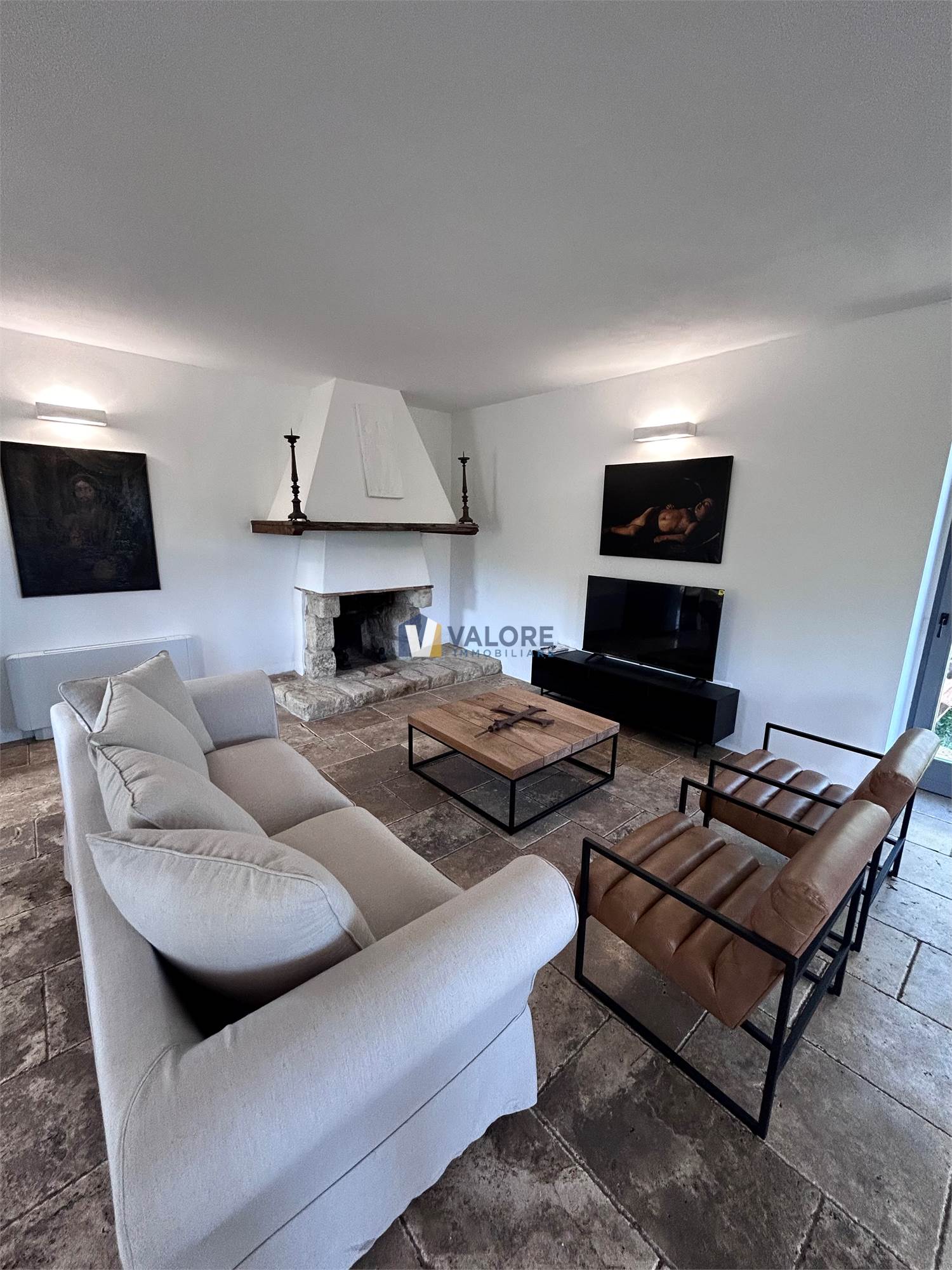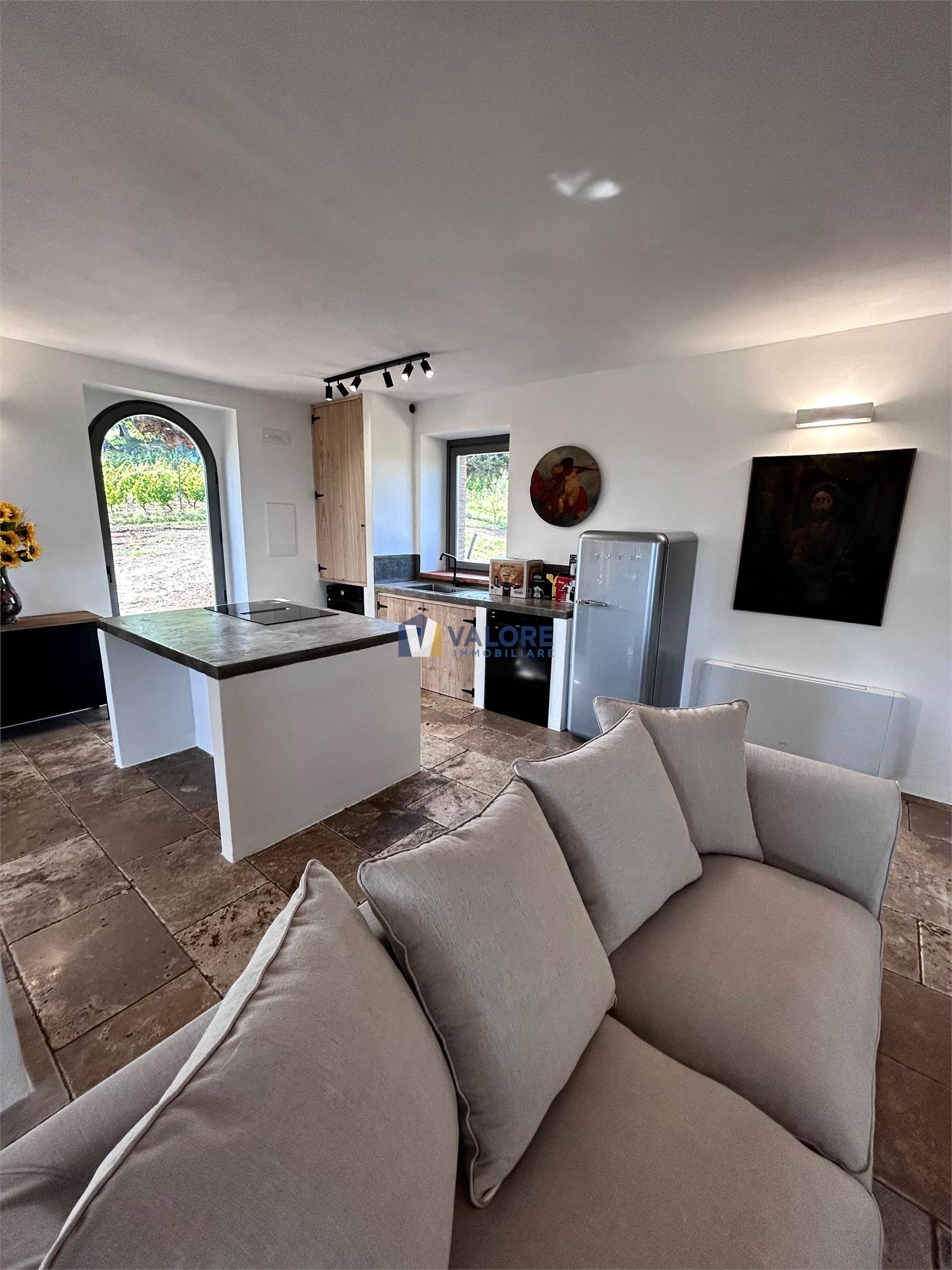 Al piano terra è presente un ampio open space con una cucina in muratura ed uno spazioso soggiorno con un suggestivo camino in pietra oltre ad un patio esterno di 35 mq.