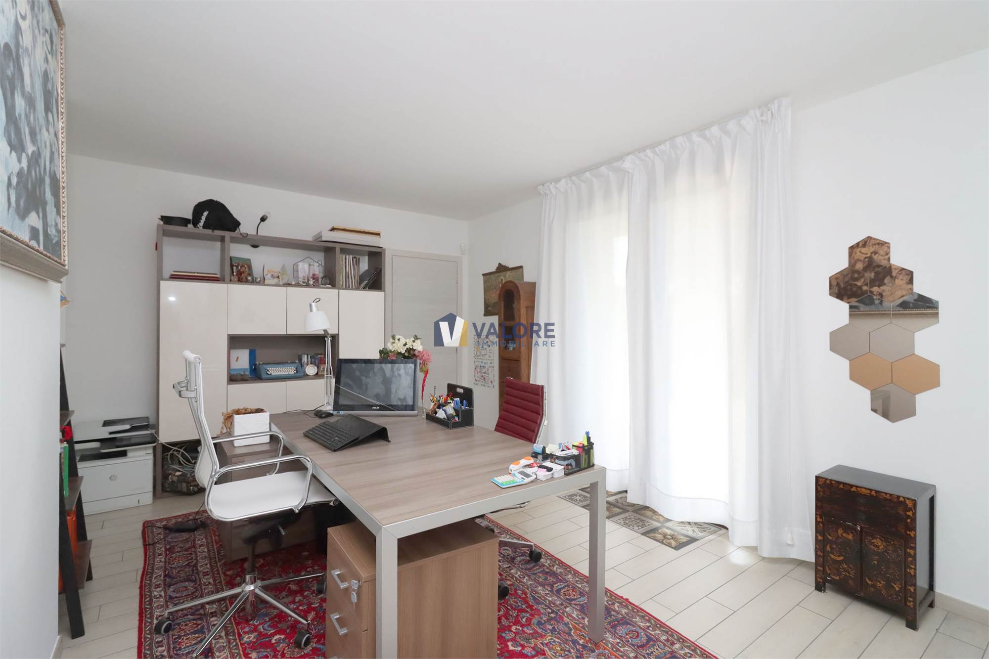 L’appartamento della superficie di circa 200 mq, si sviluppa su due piani: al piano terra è presente un ampio disimpegno attualmente adibito a studio mentre il piano primo è composto da un comodo e luminoso soggiorno dotato di ampie vetrate, cucina a vista ed accesso ad un terrazzo abitabile di circa 15 mq, tre camere da letto di cui una con balcone e cabina armadio e due bagni. Completano la proprietà garage al piano terra di circa 30 mq, fondo e giardino con irrigazione automatica e sistema di illuminazione esterna.